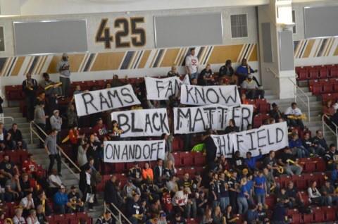 April V. Taylor After a weekend of protests during #FergusonOctober in St. Louis, Missouri that have seen protesters occupy St. Louis University, shut down three Wal-Marts, shut down Hollywood Casino and have Cornel West arrested, protesters have now unfurled banners at a St. Louis Rams Game. Approximately fifty protesters attended the game with the intent to bring Rams fans, ESPN and sports fans attention to the injustice of a black…